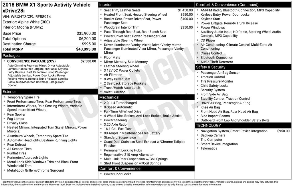 Audi VW Lenox & BMW of Lenox is proud to present you with another True Market Priced Pre-Owned Vehicle. Transparent Pricing Of $ 17599 !! This 2018 BMW X1 xDrive28i is loaded with the following Factory Options: Convenience Package (Ambient Lighting, Auto-Dimming Interior & Driver Exterior Mirrors, Auto-Dimming Rear-View Mirror, Comfort Access Keyless Entry, Lumbar Support, Panoramic Moonroof, Power-Folding Mirrors, SiriusXM Satellite Radio, and Universal Garage-Door Opener), Dakota Leather Upholstery, Heated Front Seats, and Heated Steering Wheel Convenience Package (Ambient Lighting, Auto-Dimming Interior & Driver Exterior Mirrors, Auto-Dimming Rear-View Mirror, Comfort Access Keyless Entry, Lumbar Support, Panoramic Moonroof, Power-Folding Mirrors, SiriusXM Satellite Radio, and Universal Garage-Door Opener), Dakota Leather Upholstery, Heated Front Seats, Heated Steering Wheel, 3.20 Axle Ratio, 4-Wheel Disc Brakes, 7 Speakers, ABS brakes, Advanced Real-Time Traffic Information, Air Conditioning, Alloy wheels, AM/FM radio, Automatic temperature control, Brake assist, Bumpers: body-color, CD player, Compass, Delay-off headlights, Driver door bin, Driver vanity mirror, Dual front impact airbags, Dual front side impact airbags, DVD Area Coding (North America), Electronic Stability Control, Emergency communication system: BMW Assist eCall, Exterior Parking Camera Rear, Fine-Wood 'Fineline' Trim w/Pearl Chrome Accent, Four wheel independent suspension, Front anti-roll bar, Front Bucket Seats, Front Center Armrest, Front dual zone A/C, Front fog lights, Front reading lights, Heated door mirrors, Heated Front Seats & Steering Wheel, Hi-Fi Sound System, Illuminated entry, In-Dash CD Player, Knee airbag, Leather Shift Knob, Low tire pressure warning, Memory seat, Navigation Business, Occupant sensing airbag, Outside temperature display, Overhead airbag, Panic alarm, Passenger door bin, Passenger vanity mirror, Power door mirrors, Power driver seat, Power Front Seats, Power Liftgate, Power passenger seat, Power steering, Power windows, Radio data system, Radio: Professional w/Bluetooth/USB, Rain sensing wipers, Rear anti-roll bar, Rear reading lights, Rear seat center armrest, Rear window defroster, Rear window wiper, Remote keyless entry, Remote Services, Roof rack: rails only, Security system, SensaTec Upholstery, Speed control, Speed-sensing steering, Speed-Sensitive Wipers, Split folding rear seat, Spoiler, Sport Seats, Sport steering wheel, Standard Suspension, Steering wheel mounted audio controls, Tachometer, Telescoping steering wheel, Tilt steering wheel, Traction control, Trip computer, Turn signal indicator mirrors, Variably intermittent wipers, Wheels: 18" x 7.5" Alloy Y Spoke, and Wheels: 18" x 7.5" Y-Spoke!!