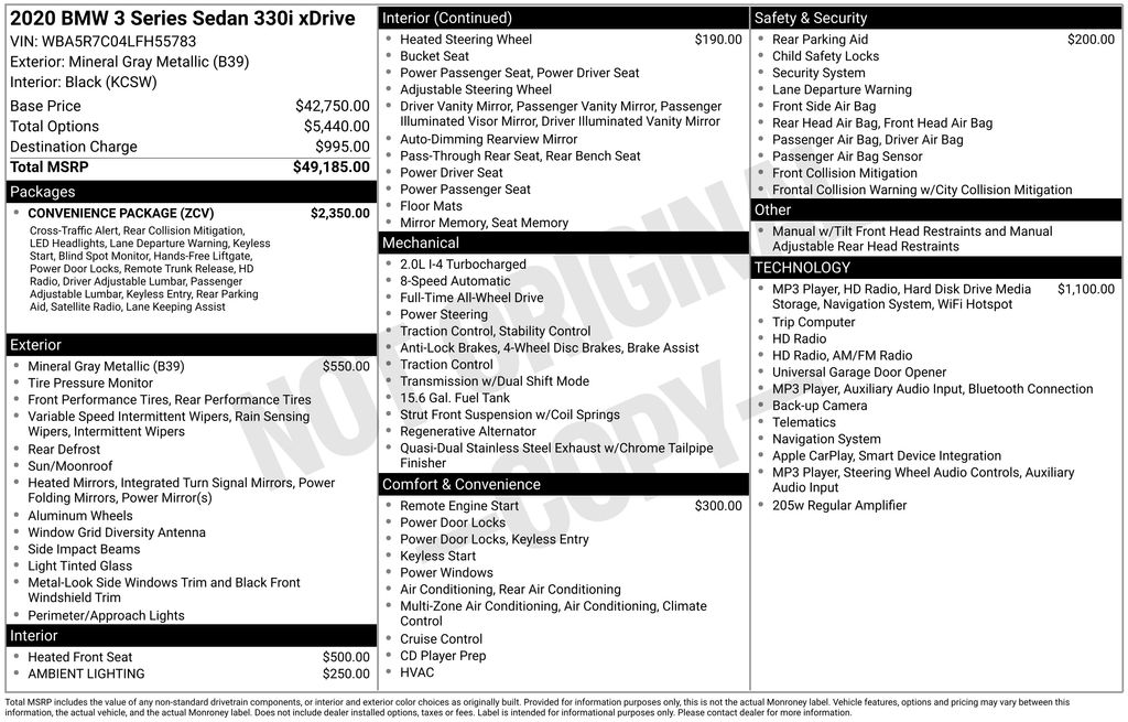 Audi VW Lenox & BMW of Lenox is proud to present you with another True Market Priced Pre-Owned Vehicle. Transparent Pricing Of $ 25999 !! This 2020 BMW 3 Series 330i xDrive is loaded with the following Factory Options: Convenience Package (Active Blind Spot Detection, Active Driving Assistant, Comfort Access Keyless Entry, LED Headlights w/Cornering Lights, Lumbar Support, and Park Distance Control), AWD, Apple CarPlay Compatibility, Heated Front Seats, Heated Steering Wheel, and Power moonroof Convenience Package (Active Blind Spot Detection, Active Driving Assistant, Comfort Access Keyless Entry, LED Headlights w/Cornering Lights, Lumbar Support, Park Distance Control, and SiriusXM Satellite Radio), Connected Package Pro, AWD, Apple CarPlay Compatibility, Heated Front Seats, Heated Steering Wheel, Power moonroof, 10 Speakers, 4-Wheel Disc Brakes, ABS brakes, Air Conditioning, Alloy wheels, AM/FM radio, Ambient Lighting, Auto-dimming door mirrors, Auto-dimming Rear-View mirror, Automatic temperature control, BMW Assist eCall, BMW TeleServices, Brake assist, Bumpers: body-color, Compass, Delay-off headlights, Driver door bin, Driver vanity mirror, Dual front impact airbags, Dual front side impact airbags, DVD Area Coding (North America), Electronic Stability Control, Emergency communication system: BMW Assist eCall, Exterior Parking Camera Rear, Four wheel independent suspension, Front anti-roll bar, Front Bucket Seats, Front Center Armrest, Front dual zone A/C, Front reading lights, Fully automatic headlights, Garage door transmitter, Genuine wood console insert, Genuine wood dashboard insert, Hands-Free Bluetooth & USB Audio Connection, HD Radio, Heated door mirrors, Hi-Fi Sound System, Illuminated entry, Leather Shift Knob, Leather steering wheel, Live Cockpit Pro w/Navi, Low tire pressure warning, Memory seat, Navigation, Navigation System, Occupant sensing airbag, Outside temperature display, Overhead airbag, Panic alarm, Passenger door bin, Passenger vanity mirror, Power door mirrors, Power driver seat, Power Front Seats, Power passenger seat, Power steering, Power windows, Radio Control US, Radio data system, Radio: AM/FM Audio System, Rain sensing wipers, Rear air conditioning, Rear anti-roll bar, Rear reading lights, Rear seat center armrest, Rear window defroster, Remote Engine Start, Remote keyless entry, Security system, SensaTec Upholstery, Speed control, Speed-sensing steering, Speed-Sensitive Wipers, Split folding rear seat, Sport Seats, Sport steering wheel, Steering wheel mounted audio controls, Tachometer, Telescoping steering wheel, Tilt steering wheel, Traction control, Trip computer, Turn signal indicator mirrors, Variably intermittent wipers, and Wheels: 18" x 7.5" V-Spoke Bi-Color Orbit Grey!!